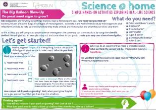 Use this Science@Home investigation to explore the question "Do yeast need sugar to grow?". Download the workbook, follow the instructions and build confidence in using the scientific method. Don't forget to collect a certificate! Science@Home is a series of simple hands-on activities that explore real-life science. Each investigation includes:Workbook with instruction guide, that can be downloaded and printed or used on a mobile device. With guiding questions to support your young explorer through their investigation.A critical reading text about the work of our scientists, to help develop your child's scientific thinking.A guide for grown-ups, that gives some tips and hints about the investigation and the scientific method.A certificate to reward your child's scientific achievement.To download this investigation please click the link below, please note that we will ask you three short questions before giving the links. We do not request any personal information and only use the information to report back to our funders. The University of Edinburgh is a charitable body, registered in Scotland, with registration number SC005336. Document Science at Home | Big Balloon Blow-Up Investigation (1.51 MB / PDF) Document Big Balloon Blow-up certificate (420.01 KB / PDF) Terms and Conditions Safety NoticeWhilst every effort has been made to ensure the accuracy and safety of this science project The University of Edinburgh is not liable for the actions of activity of any person who uses the information in this resource or in any of the suggested further resources. The University of Edinburgh assumes no liability with regard to injuries or damage to property that may occur as a result of using the information and carrying out the practical activities contained in this resource or in any of the suggested further resources. These activities are designed to be carried out by children under the supervision of a parent, guardian or other appropriate adult. The adult involved is fully responsible for ensuring that the activities are carried out safely by the children.All Science@Home investigations have been fully risk assessed by the University of Edinburgh. If you wish a copy of risk assessment please email ebsoc@ed.ac.uk and list the name of the investigation. Creative Commons LicencingThis work by University of Edinburgh is licensed under a CC BY-NC-ND Creative Commons Attribution 4.0 International License. This means that while copy and redistribute the material in any medium or format. Under the following terms:Attribution — You must give appropriate credit, provide a link to the license, and indicate if changes were made. You may do so in any reasonable manner, but not in any way that suggests the licensor endorses you or your use.Non-Commercial — You may not use the material for commercial purposes.NoDerivatives — If you remix, transform, or build upon the material, you may not distribute the modified material. Curriculum Links Curriculum Area: ScienceCurriculum Themes: Inquiry and investigative skills, scientific analysis and thinking skills, skills and attribute of scientifically literate citizens, microorganisms, planet earth, biological systems, global warming, topical scienceCurriculum Learning Level (Scotland): Second (P5-P7), Third/Fourth (S1-S3)Scottish Curriculum for Excellence Experiences and Outcomes: SCN 2-01a, SCN 2-13a, SCN 2-19a, SCN 2-20a, SCN 2-20b SCN 3-03a, SCN 3-05b, SCN 3-13b, SCN 3-19a, SCN 3-20a, SCN 4-02b, SCN 4-05b, SCN 4-13b, SCN 4-20a Curriculum Learning Level (England): KS2 (years 5-6), KS3 (years 7 - 8) This article was published on 2024-09-02