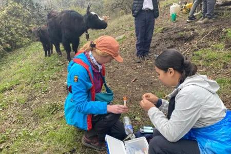 Scientists explore antimicrobial resistance (AMR) in Yaks at altitude, using DNA samples and farmer interviews to understand AMR drivers in remote livestock systems. A team of researchers conducted an interdisciplinary high-altitude field study in the Everest region of Nepal, combining DNA sampling and social science methods to investigate antimicrobial resistance (AMR) in Yak milk and the farming practices that influence it.The team trekked through the Himalayas reaching elevations near 4,000 metres, collecting milk samples and qualitative data in the form of interviews with local community members and field ethnographies. The milk samples are being analysed to explore the presence of antimicrobial resistance genes, while interviews and ethnographic data are being examined to understand key drivers of AMR. The results will allow researchers to consider how antimicrobial resistance is driven within high altitude bovine species in Nepal and identify optimal husbandry practices to minimise future AMR evolution and transmission. This interdisciplinary pilot study combines microbiology, social and veterinary sciences to examine the scientific and social dimensions of AMR in high-altitude livestock systems. By studying biological and social data, the research team aims to link biological findings with husbandry practices and environmental context. Researchers collect milk samples. Fieldwork at altitude Researchers from the Division of Global Agriculture and Food Systems of the Royal (Dick) School of Veterinary Studies, the Roslin Institute, and Nepal’s Research Institute for Bioscience and Biotechnology (RIBB) collected milk samples at the government-managed Yak Genetic Resource Centre in Syangboche, Eastern Nepal. The team also took additional samples from cows and cow–Yak hybrids during the team’s descent into lower altitude regions. Although full genetic testing of the milk was not completed on-site, the fieldwork served as a valuable test of the feasibility of high-altitude AMR surveillance under resource-limited conditions, researchers explain. DNA was extracted directly from fresh Yak milk at the highest elevation ever attempted. We used a portable setup for sample collection, carrying most of the lab consumables and lightweight instruments throughout the trekking journey. Rojlina (Rose) Manandhar Research Institute for Bioscience and Biotechnology Mixed methods Alongside DNA sampling, qualitative methods such as interviews and observations with local farmers rearing Yak and cow-Yak hybrids, known as chauri, were central to the study. This interdisciplinary approach will be used to contextualise laboratory findings and identify potential behavioural and social drivers of AMR. Through our interviews, we looked at husbandry practices — how farmers fed and treated their animals, what they did when animals were sick, and who they consulted for veterinary support. Dr Jess Mitchell Global Agriculture and Food Systems Welfare standards Field observations revealed strong animal welfare and biosecurity practices among high-altitude livestock owners. “Yak and hybrid farming practices in this region of Nepal are gold standard in terms of promoting animal welfare, biosecurity and One Health,” said Dr Mitchell. “These species hold a vast cultural importance in the region, and animals are cared for under traditional systems, with antimicrobial use only occurring in response to disease or infected injuries and via consultation with veterinary professionals. We did not find evidence of antimicrobial use as prophylaxis or growth promotion; these practices are recognised globally as key drivers of AMR and are particularly common in Nepal’s lowland agricultural systems.” Larger-scale DNA sampling, improved field sequencing methods and further interviews are planned, building on the lessons learned in this pilot study. This fieldwork was funded by the University of Edinburgh International Partnership Award, and DNA samples were collected in collaboration with the Khumbu Pasanglhamu Rural Municipality office. Our fieldwork highlighted the logistical, technical and interpersonal challenges of working in extreme environments. The open, accommodating response from the local farmers helped to alleviate the challenges we encountered. We are extremely grateful for this, and of course, the many cups of hot tea we received along the way. Professor Neil Mabbott Roslin Institute Publication date 23 Jul, 2025