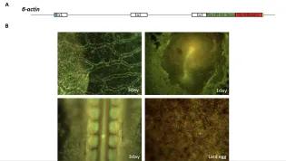 Ubiquitous expression of life-act-VenusFP (1), and nuclear-cherryFP (2) transgenes Summary & UtilityThe ACTN chicken line is a powerful tool for developmental biology, facilitating studies of morphogenic movement, fate mapping and tissue grafting. The two reporter constructs (Lifact1 and H2B-cherry2) are expressed ubiquitously in early embryos and extra embryonic tissues. The ACTN line is potentially more useful than the other reporter lines as both cell membranes (Lifact) and nuclei (H2B-cherry) are distinctly labelled. A. Schematic of β-actin targeted locus. B. Images of GFP and RFP expression as several developmental stages. Line details & originThe ACTN line was created via BBSRC funding to Professor Kees Weijer (University of Dundee). The line was generated by transfection of male primordial germ cells (PGCs) with a reporter gene targeted to the beta-actin locus. The male PGCs are carried by a sterile male surrogate host cockerel3 (Hy-line Brown). The surrogate male is bred to wildtype Hy-line Brown layer hens providing experimental eggs. The male PGCs are heterozygote for the insert, providing eggs that are 50% ACTN and 50% wildtype. The original funding for this line was provided by the BBSRC (grant numbers: BB/T006781/1, BB/T005815/1).To reference this line for publications please contact the NARF.PublicationsRiedl J, Crevenna AH, Kessenbrock K, Yu JH, Neukirchen D, Bista M, Bradke F, Jenne D, Holak TA, Werb Z, Sixt M, Wedlich-Soldner R. 2008. Lifeact: a versatile marker to visualize F-actin. Nat Methods. 2008 Jul;5(7):605-7.Huss D, Benazeraf B, Wallingford A, Filla M, Yang J, Fraser SE, Lansford R. 2015. A transgenic quail model that enables dynamic imaging of amniote embryogenesis. Development. 142(16):2850-9.Ballantyne M, Woodcock M, Doddamani D, Hu T, Taylor L, Hawken RJ, McGrew MJ. 2021. Direct allele introgression into pure chicken breeds using Sire Dam Surrogate (SDS) mating. Nat Commun. 12(1):659 This article was published on 2024-09-02