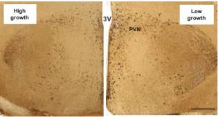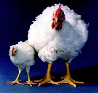 Advanced intercross of a broiler and white leghorn SummaryThis line is an advanced intercross between a broiler chicken (Ross Breeders Ltd., Newbridge, Midlothian, UK) which is rapidly growing and has relatively poor reproduction and a white Leghorn which grows relatively slowly and has superior egg production1,2. The advanced intercross line has been used to identify and map Quantitative Trait Loci (QTL) that affect body weight1,3,4, the amount and distribution of body fat2 and bone mineral density5.UtilityThe advanced intercross line helped to identify how variation in certain genes can alter specific physiological pathways, which in turn lead to changes in growth and fat deposition. Research conducted with the advanced intercross line identified a locus on chromosome 4, which is responsible for up to a 19% difference in body weight in chickens at 12 weeks of age. Advanced intercross offspring can possess a high-growth or low-growth haplotype at the locus on chromosome 4, which is in the vicinity of the cholecystokinin receptor A (CCKAR) gene. Examples of the founder lines at 6 weeks of age, with the white leghorn on the left and the broiler on the right. Cholecystokinin and its receptor (CCKAR) play an important role in satiety feedback pathways between the brain and digestive organs. Cholecystokinin is a gut peptide that is elevated after a meal, leading to the reduction or cessation of feeding. High-growth advanced intercross chickens have lower expression of CCKAR in the brain, intestine, and pancreas, and do not reduce food intake after they have been exogenously administered with cholecystokinin6. They also have elevated agouti-related peptide expression, the major orexigenic peptide in the hypothalamus6. Therefore, the advanced intercross line can be used to study the effect of the CCKAR locus on growth. The difference in CCKAR expression in neurons in the PVN of the hypothalamus between the high and low growth haplotypes (From Dunn et al. 2013). Line originChickens from a broiler line and a white Leghorn line were intercrossed to produce an F1 comprising 13 female and 11 male chickens, arranged into 13 pairings7. The offspring of these F1 families were intercrossed using a mating system to minimise inbreeding8. Each generation after the F1 was reproduced from 60 males and 60 females until generation 18. For full details see Sewalem et al (2002)1. Thereafter, the population was maintained based on maintaining heterozygosity at the CCKAR genomic locus using genetic markers6. It is likely that the population continues to segregate for other traits that differed between the founder lines including ocular dimensions that have been already studied7, but also growth and reproductive traits.PublicationsSewalem, A. et al. Mapping of quantitative trait loci for body weight at three, six, and nine weeks of age in a broiler layer cross. Poult. Sci. 81, 1775–1781 (2002).Ikeobi, C. O. N. et al. Quantitative trait loci affecting fatness in the chicken. Anim. Genet. 33, 428–435 (2002).Podisi, B. K., Knott, S. A., Burt, D. W. & Hocking, P. M. Comparative analysis of quantitative trait loci for body weight, growth rate and growth curve parameters from 3 to 72 weeks of age in female chickens of a broiler-layer cross. BMC Genet. 14, (2013).Podisi, B. K. et al. Overlap of quantitative trait loci for early growth rate, and for body weight and age at onset of sexual maturity in chickens. Reproduction 141, 381–389 (2011).Podisi, B. K., Knott, S. A., Dunn, I. C., Burt, D. W. & Hocking, P. M. British Poultry Science Bone mineral density QTL at sexual maturity and end of lay Bone mineral density QTL at sexual maturity and end of lay. Br. Poult. Sci. 53, 763–769 (2012).Dunn, I. C. et al. Decreased expression of the satiety signal receptor CCKAR is responsible for increased growth and body weight during the domestication of chickens. Am. J. Physiol. Endocrinol. Metab. 304, 909–921 (2013).Prashar, A. et al. Common determinants of body size and eye size in chickens from an advanced intercross line. Exp. Eye Res. 89, 42–48 (2009).Falconer, D. S. Replicated selection for body weight in mice. Genet. Res. 22, 291–321 (1973). This article was published on 2024-09-02