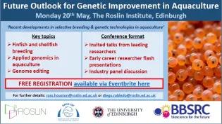 A one-day symposium on the application of genetic technologies for the improvement of aquaculture. 20/05/2019 On the 20th of May, the Roslin Institute hosted a conference entitled "Future Outlook for Genetic Improvement in Aquaculture". The event covered numerous topics, including :Finfish and shellfish breedingApplied genomics in aquacultureGenome editingThe format of the conference moved over the course of the day, suited to the focus (and type) of discussion. Such stages included: Invited talks from leading researchersEarly career researcher flash presentationsIndustry panel discussion The Roslin Institute's aquaculture personnel will be able to glean excellent new insights from this collaboration alongside partners in academia and the industry.